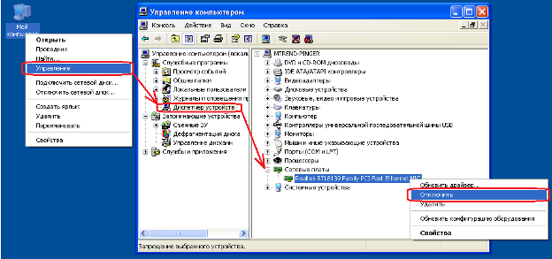 Так же нужно проверить в Диспетчере устройств состояние сетевой карты (значок сетевой карты перечеркнут красным крестиком). Порядок включения сетевой карты смотрите в описании ошибки 676.
