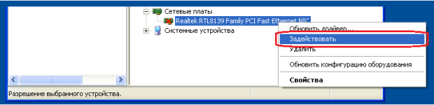 Нажав правой кнопкой мыши, выбираете "Отключить", а затем "Задействовать" и повторяете попытку подключения. Если сетевая плата отсутствует в диспетчере устройств, то она либо отключена в BIOS, либо не установлен драйвер на сетевую плату. Если перед пиктограммой отображен один из знаков: знак вопроса, восклицательный знак, то драйвер на сетевую плату установлен некорректно. Переустановите драйвер, перезагрузите компьютер и повторите попытку подключения.