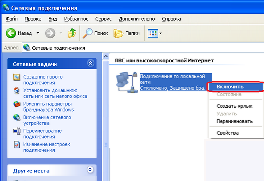 3. Затем необходимо нажать правой кнопкой мыши на Подключение по локальной сети и выбрать в меню "Включить".