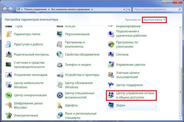 3. В меню «Просмотр по:» выбираем «Крупные значки». Заходим в «Центр управления сетями и общим доступом»