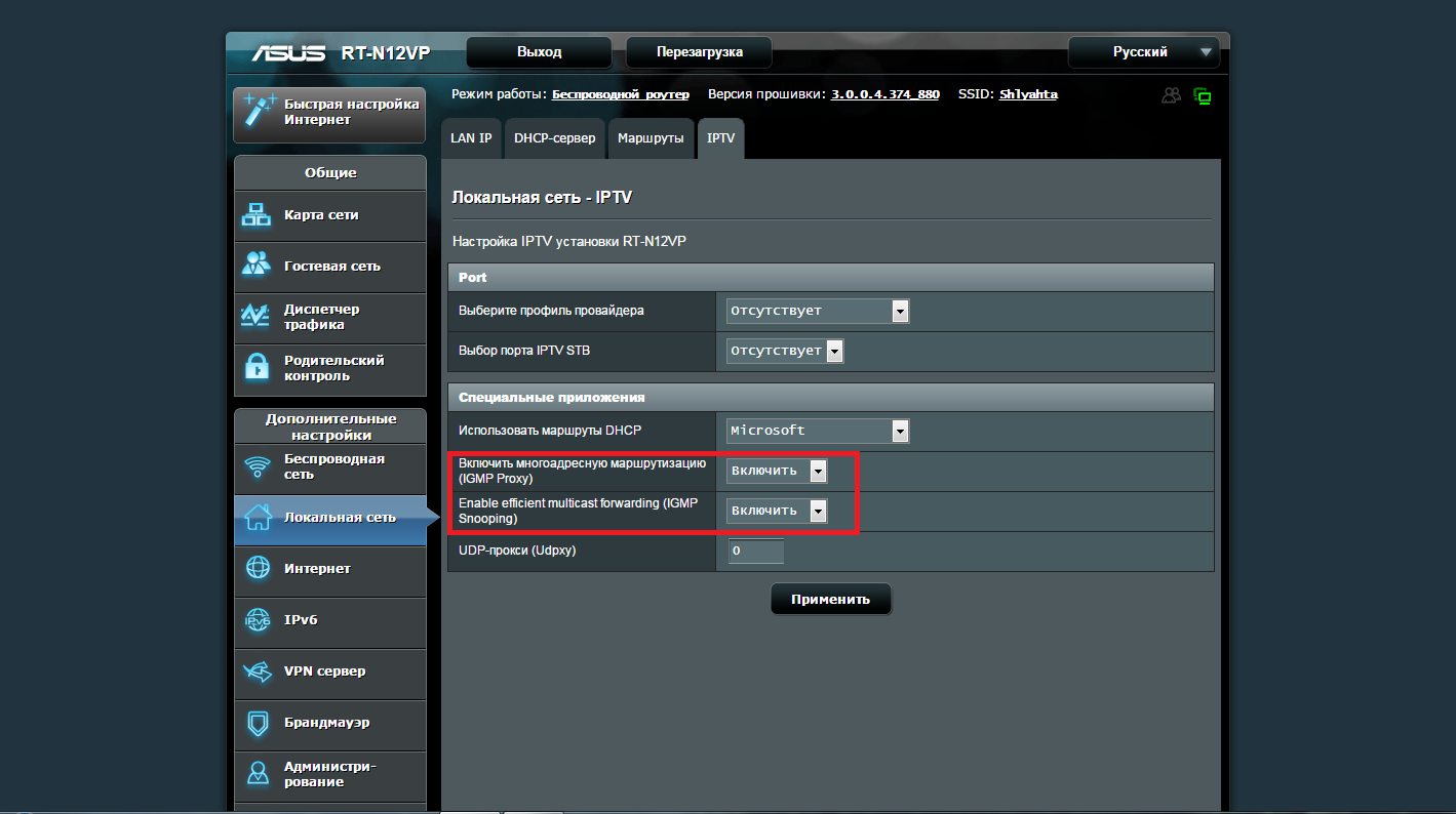 Для работы IPTV необходимо зайти в раздел «Локальная сеть» на вкладку «IPTV» и включить многоадресную маршрутизацию: