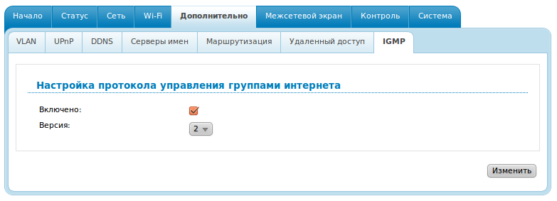 Заходим в раздел Дополнительно, открываем вкладку IGMP и проверяем - в строкеВключено должна стоять галочка, в строке Версия из выпадающего списка должно быть выбрано значение 2. Если параметры иные - меняем их и нажимаем на кнопку Изменить.
