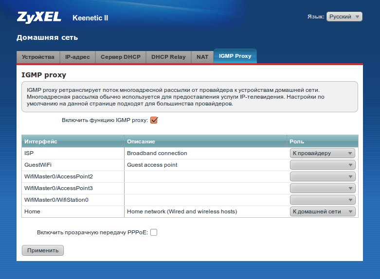 Заходим в раздел ДОМАШНЯЯ СЕТЬ, выбираем вкладку IGMP Proxy  и проверяем - в строке Включить функцию IGMP proxy должна стоять галочка. Если галочка не стоит - выставляем её и нажимаем на кнопку Применить. Роутер перезагрузится.